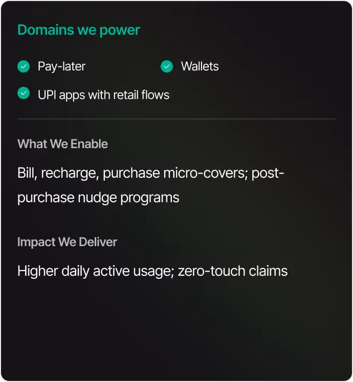 A wide range - travel, health, PA, device, credit-life, EMI protect, gig worker protect, shipment/parcel, cancellations (CFAR/CFVR), mobility, card protection, cyber covers, and more. We co-create custom products with insurers based on your user journeys and revenue goals.
