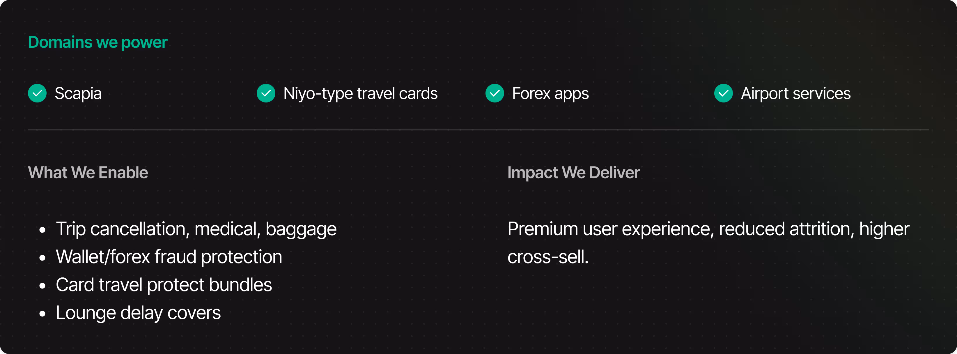 A complete stack of travel protection and value-added services designed for OTAs, visa-tech platforms, travel fintechs, and mobility partners enabling safer trips, higher conversion, and a better user experience.