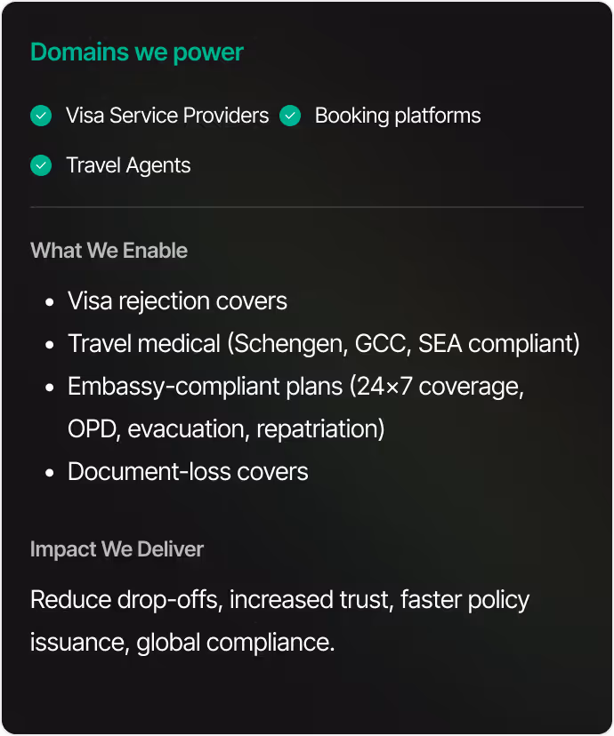 Embedded travel & mobility insurance for OTAs, visa-tech, neobanks, and mobility platforms with plug-and-play APIs, dynamic pricing, smart claims, and global insurer integrations.