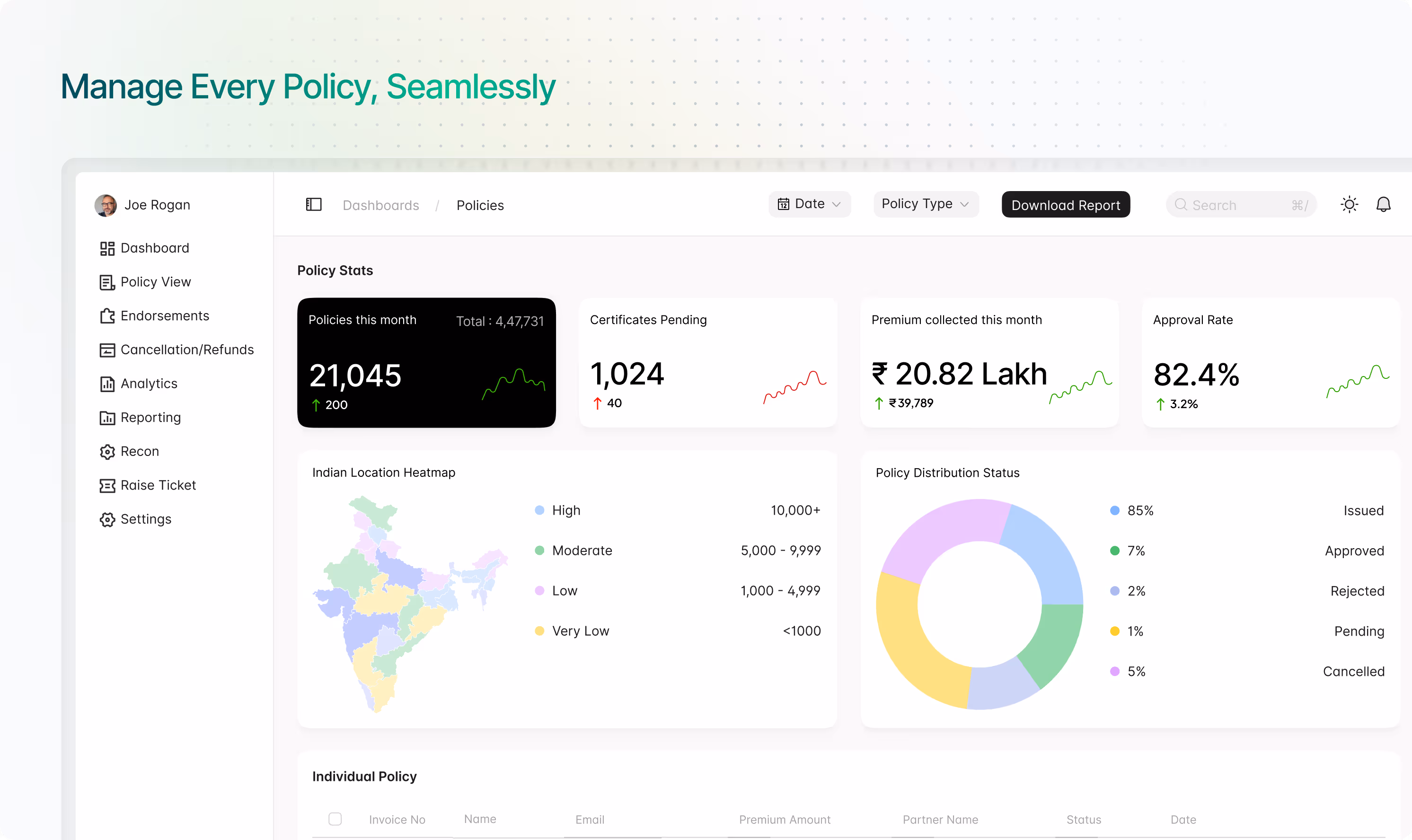 A single dashboard to issue, track, and service policies at scale - reducing TAT and ensuring real-time policy visibility across products and insurers.